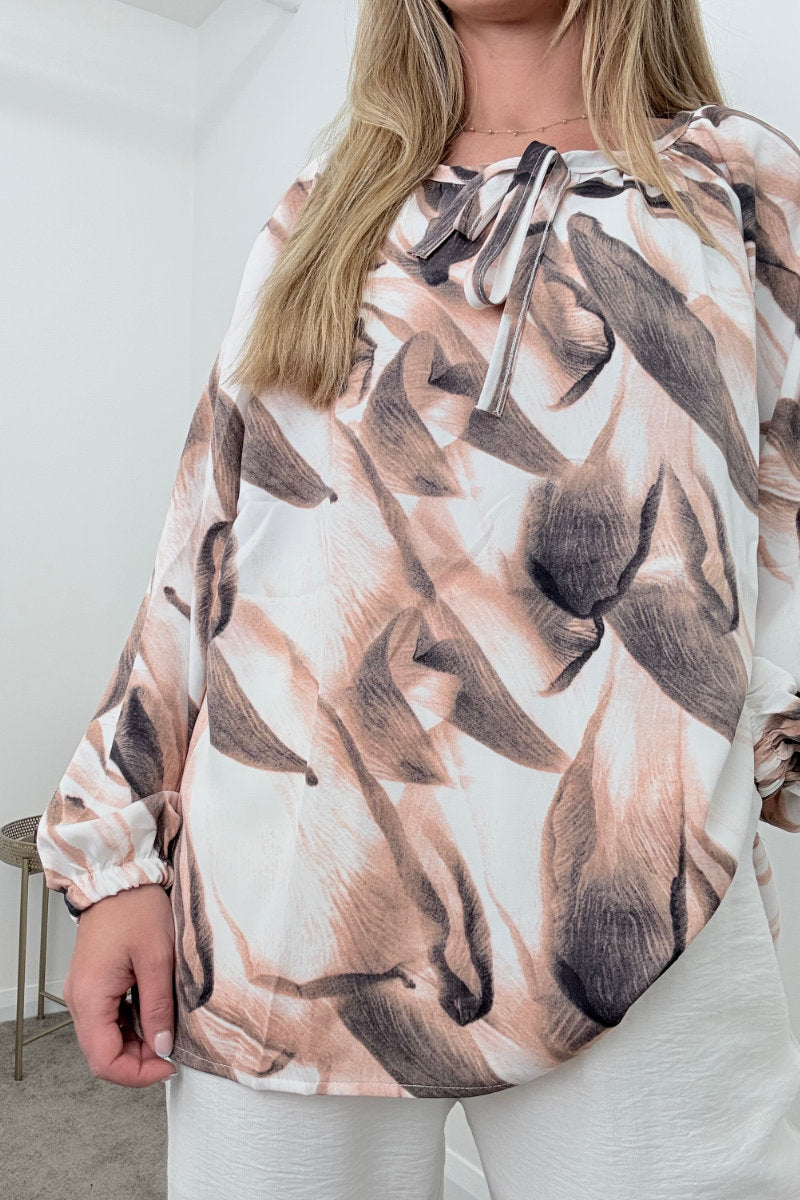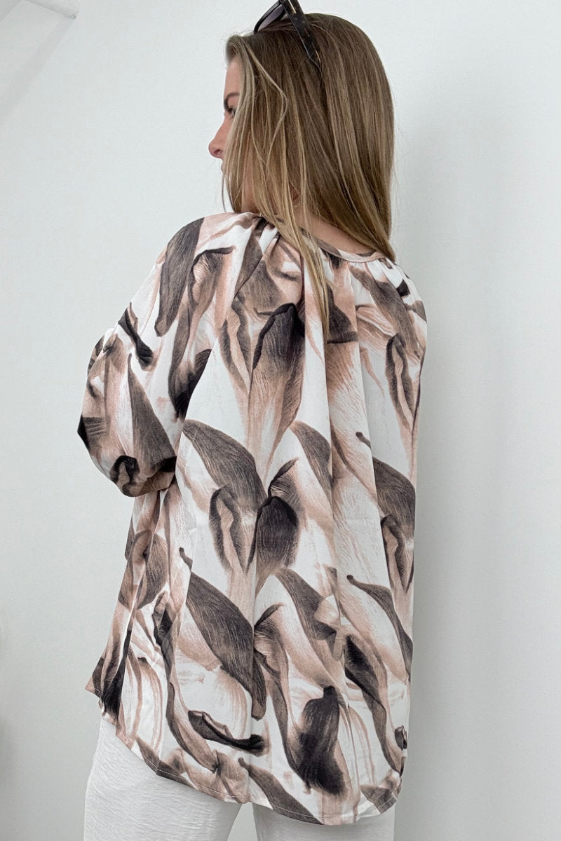 Effortlessly stylish and light as air, this abstract blouse brings contemporary edge to everyday comfort. Featuring a soft, fluid silhouette with a painterly brushstroke design in muted grey tones, it’s the ideal throw-on top that works just as well tucked in as it does worn loose. The gathered neckline with a dainty tie detail adds a feminine finish, while the relaxed fit and elasticated cuffs offer ease and versatility.