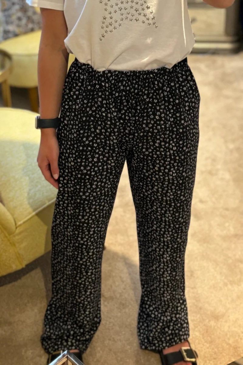 Embrace laid-back elegance with these lightweight black trousers, featuring an all-over delicate white floral print. With a relaxed, full-length fit and soft, fluid fabric, they’re perfect for both lounging and stepping out. Pair with the matching top or a simple tee for effortless styling.