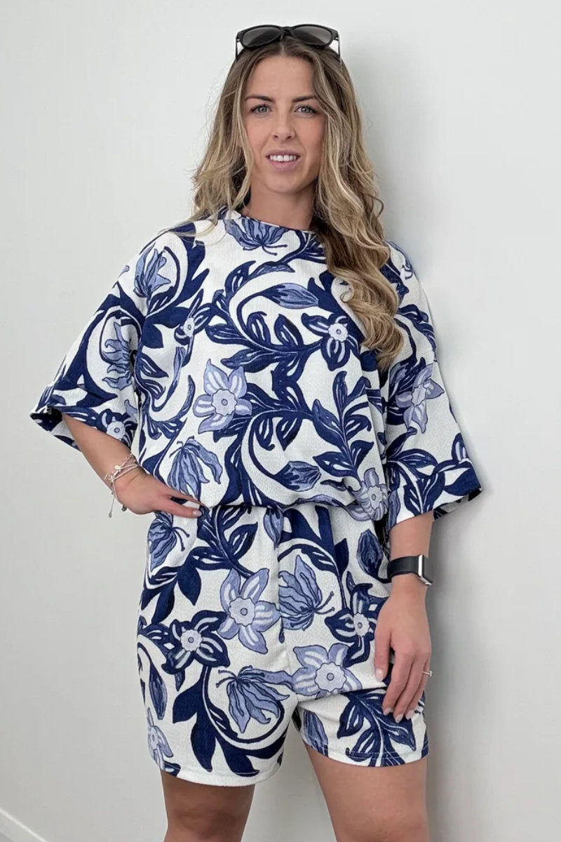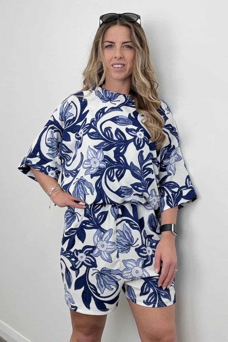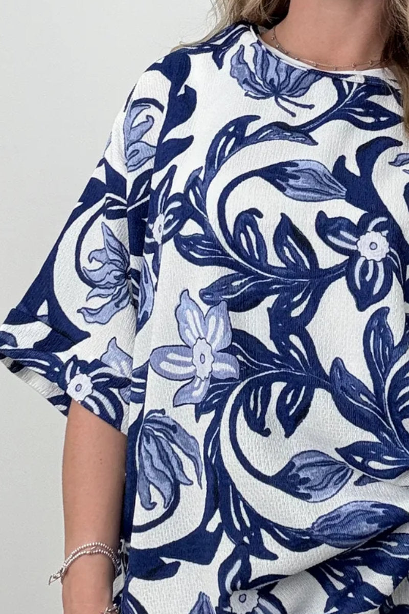 Add a bold statement to your summer wardrobe with this Blue & White Printed Top, featuring a swirling floral design in rich navy tones. The oversized silhouette and dropped shoulders offer effortless comfort, perfect for relaxed days or resort-style layering. Style it solo or complete the co-ord look with the matching shorts.