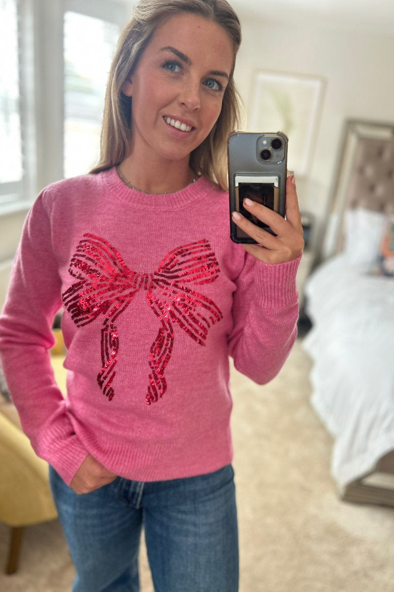 A fun and festive addition to your winter wardrobe, this pink sequin bow knitted jumper is designed to bring a little sparkle to your everyday look. Crafted from a soft, comfortable knit, it features a striking textured bow made of shimmering sequins, making it perfect for holiday parties, Christmas gatherings, or simply adding a cheerful touch to cold-weather days. The crew neck and easy-to-wear fit ensure you stay cosy and stylish all season long.