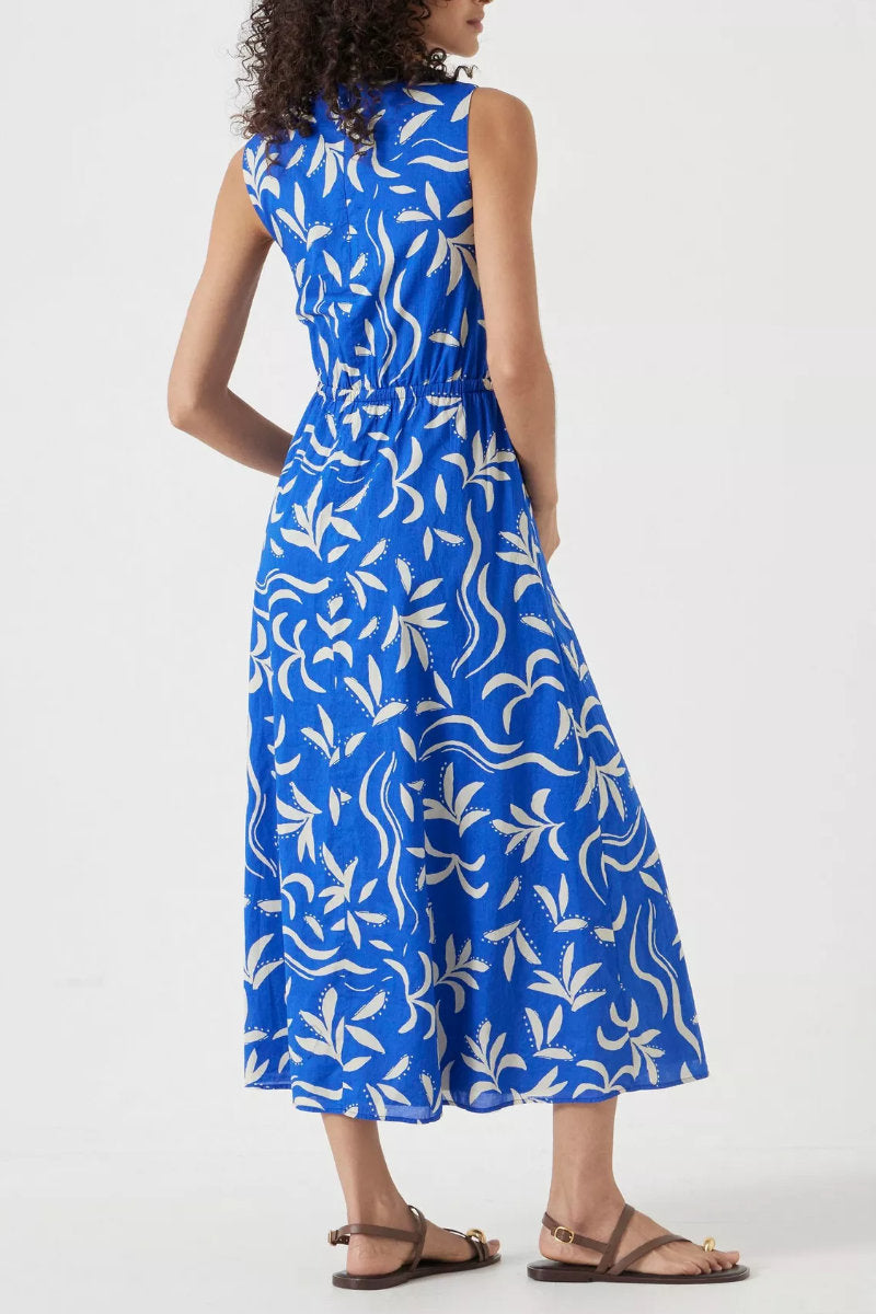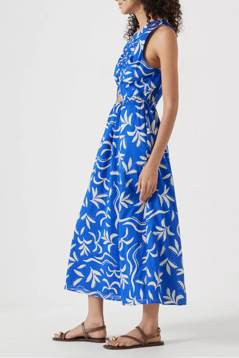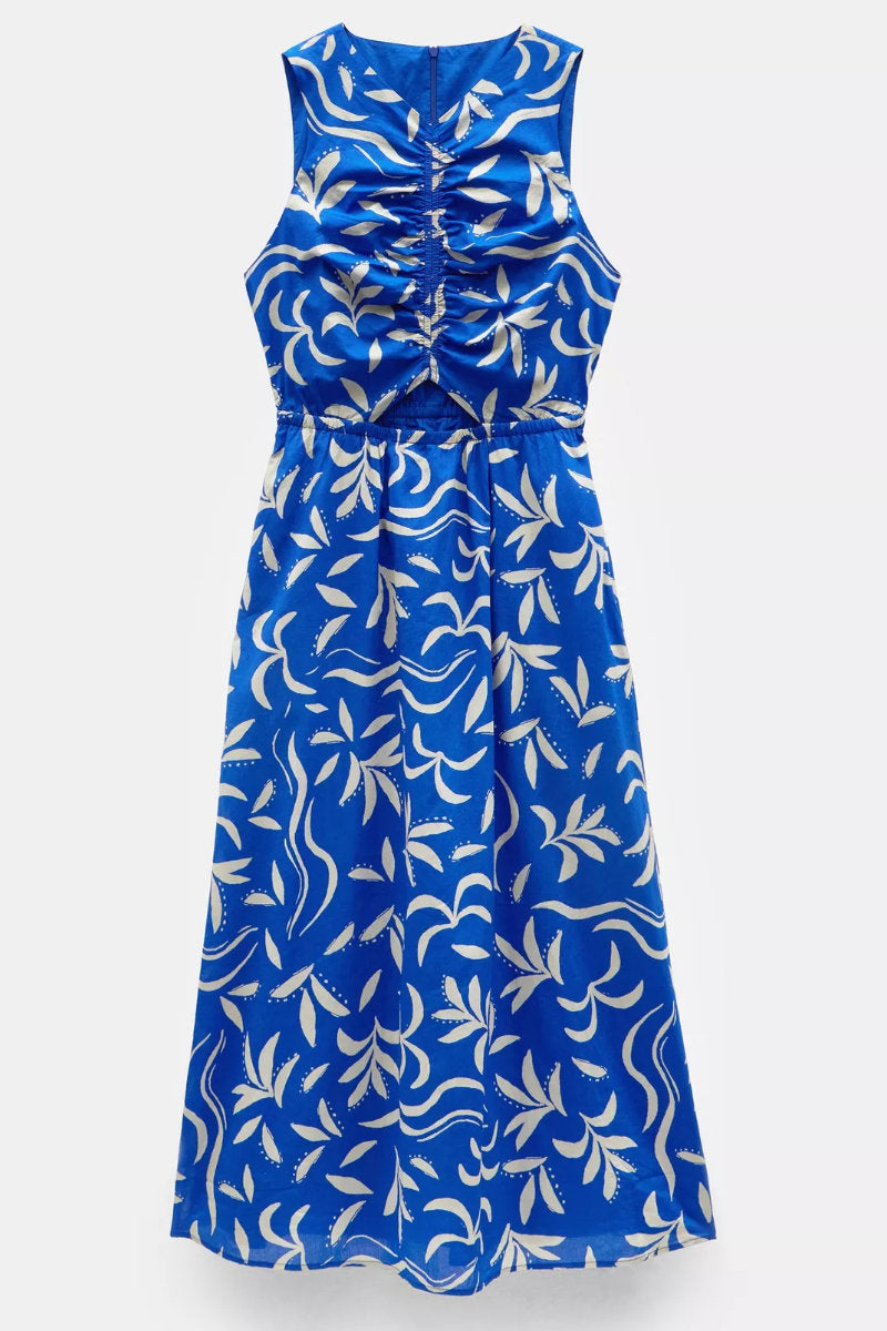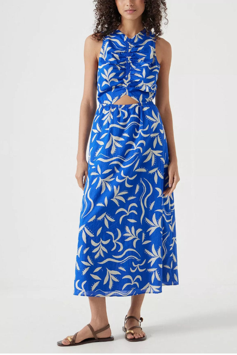 A striking summer staple with a luxe feel at an unbeatable price, this Ex HUSH Gathered Front Dress blends laid-back comfort with standout detail. Crafted from 100% breezy cotton in a vibrant cobalt blue leaf print, it’s designed in an effortless A-line silhouette that falls to a flattering midi length. The gathered ruching across the bodice adds shape and texture, while the small cut-out under the bust introduces a subtle edge without compromising on wearability.