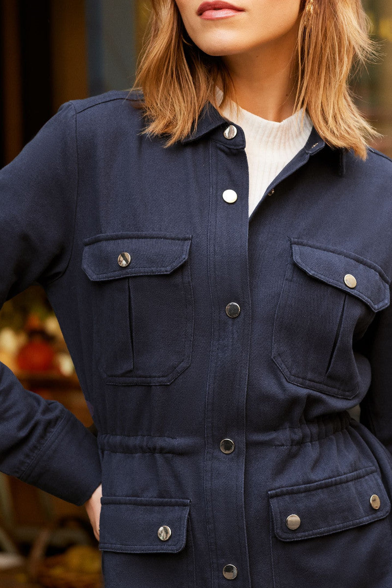 This navy utility-style jacket is the ultimate smart-casual staple. Designed with a flattering cinched waist and crafted from a soft cotton blend, it’s ideal for layering over knits, tees, or dresses. Statement pockets and pale gold button fastenings elevate this everyday hero with a touch of polish.