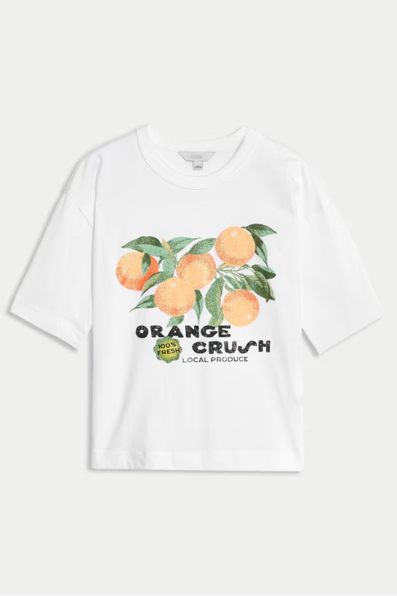 This boxy t-shirt is crafted from pure heavyweight cotton, offering a luxurious feel. Designed in an oversized fit, it features short sleeves and a classic crew neckline. The vibrant graphic print of oranges adds a statement touch, seamlessly blending classic and contemporary styles.
