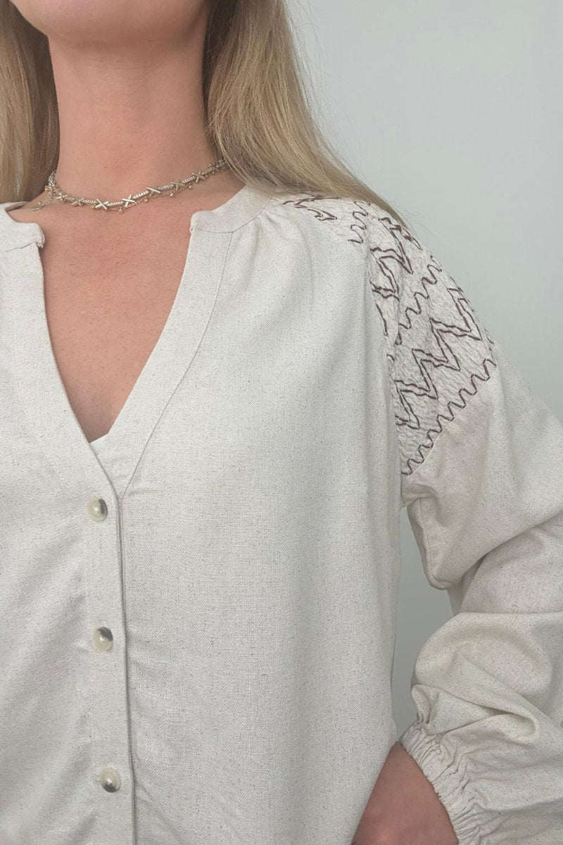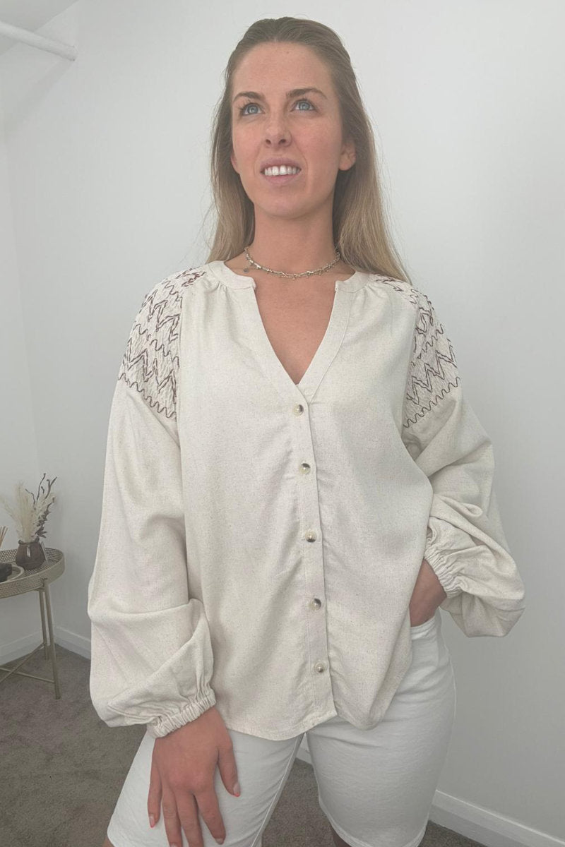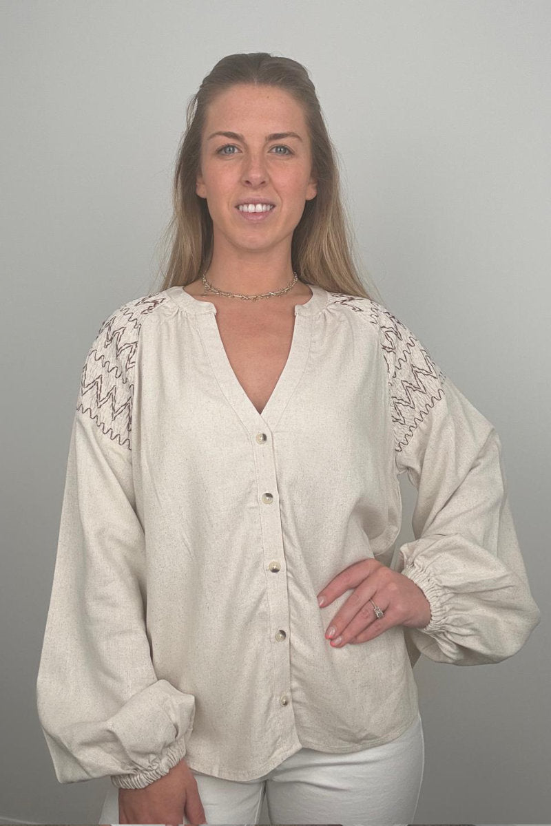 A breezy neutral blouse you’ll reach for all season long. This Ex Nutmeg Stone Blouse is soft to the touch and effortlessly stylish, designed in a relaxed silhouette with beautiful embroidered detailing across the shoulders. The lightweight blend of viscose, linen, lyocell and cotton offers an airy, breathable feel – perfect for warm days or layering on cooler evenings. Subtle gathers and a flattering V-neckline complete the laid-back look.