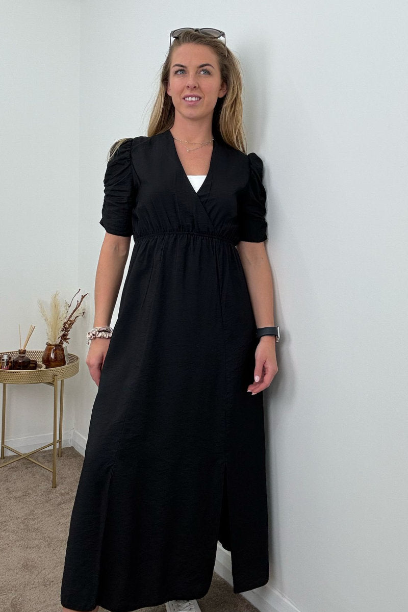 A statement dress that blends elegance with comfort, this black midi dress is designed to turn heads. Featuring a flattering wrap neckline, ruched short sleeves, and a flowing silhouette with subtle front splits, it's the perfect piece for any occasion.