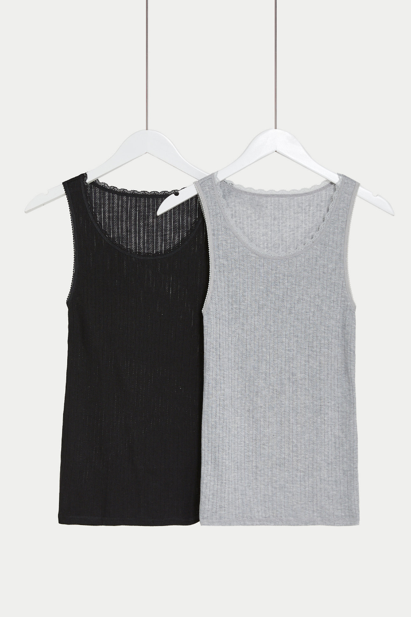 Stay toasty on cooler days with the insulating fabric of these thermal vests. Both feature a stylish textured design and scalloped trims along with a wider shoulder strap for extra comfort. Made with responsibly sourced viscose.