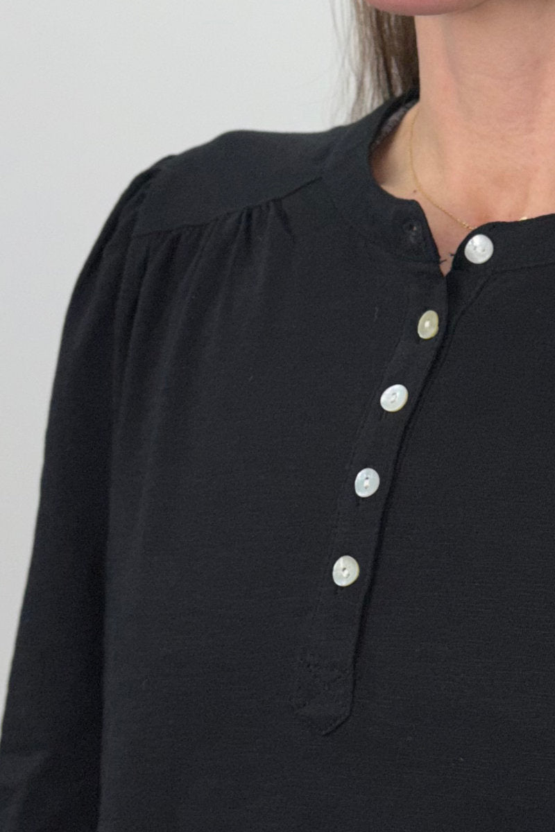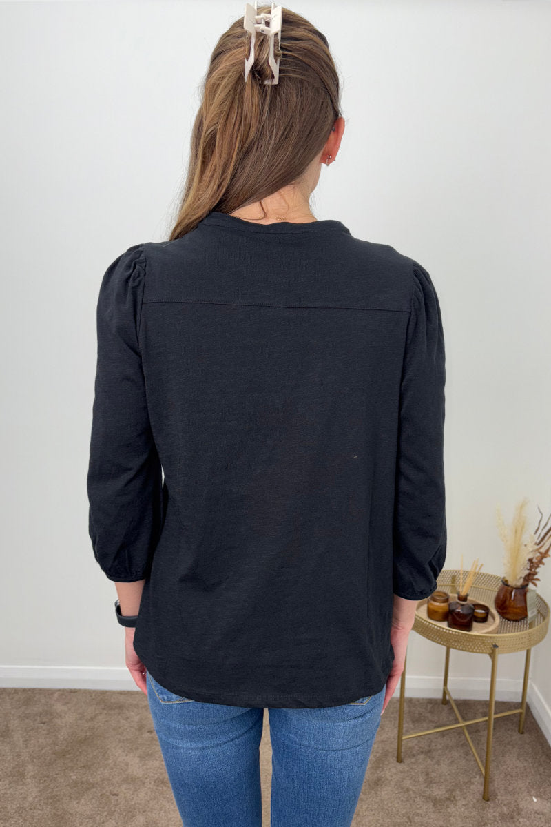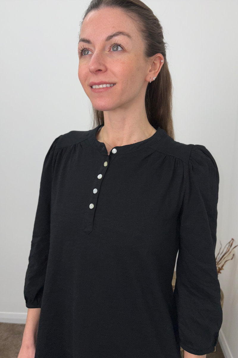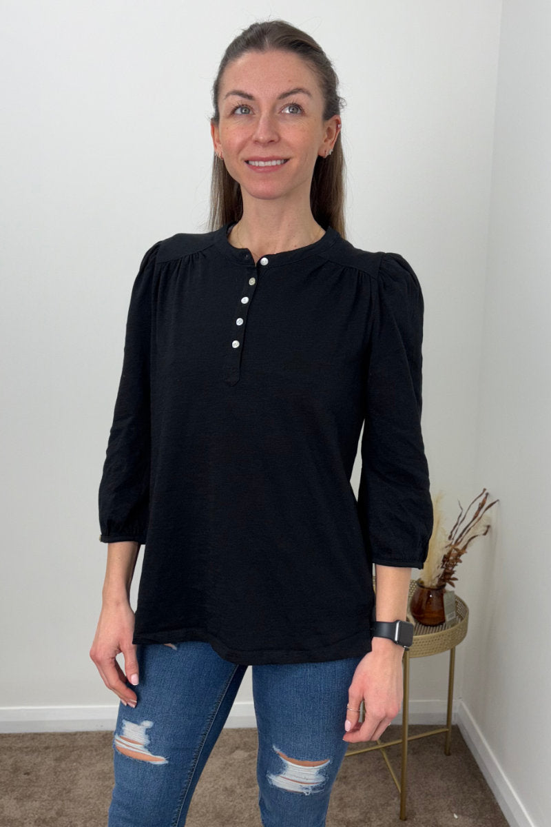This timeless black top is a wardrobe staple you'll reach for time and time again. Designed with a relaxed fit, it features charming button-through details and versatile 3/4 length sleeves, offering effortless style for both casual and smart occasions. Made from 100% cotton, this piece provides ultimate comfort and breathability. Pair it with your favourite jeans for an easy, stylish look.