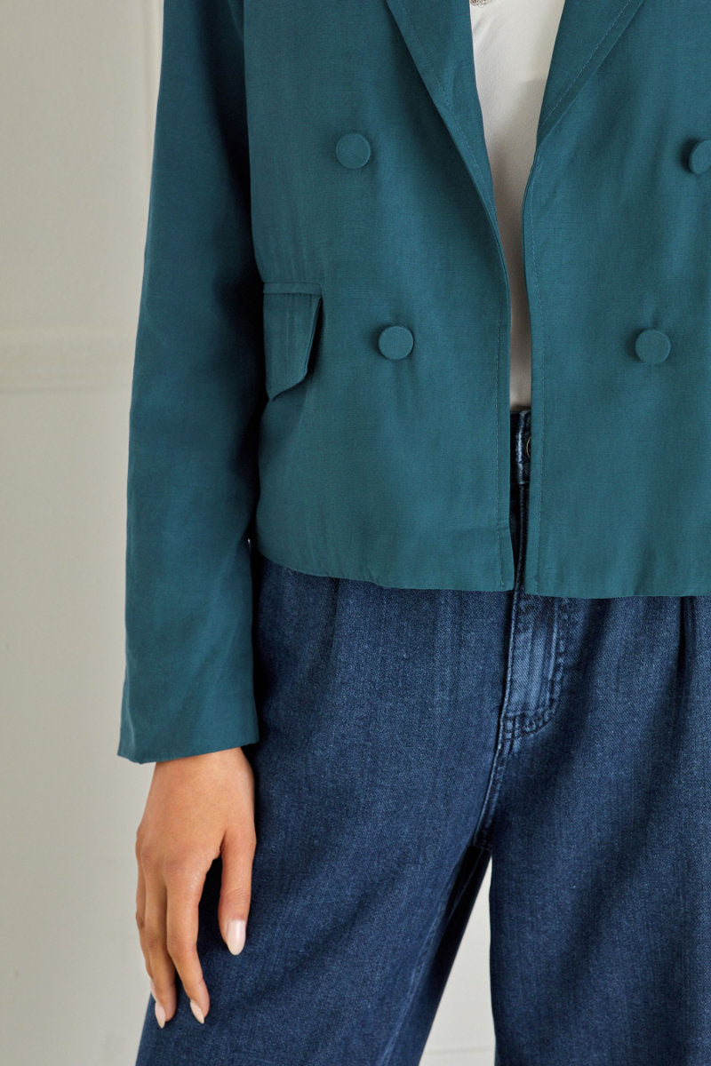 Famous Store Cropped Double Breasted Relaxed Fit Blazer Teal