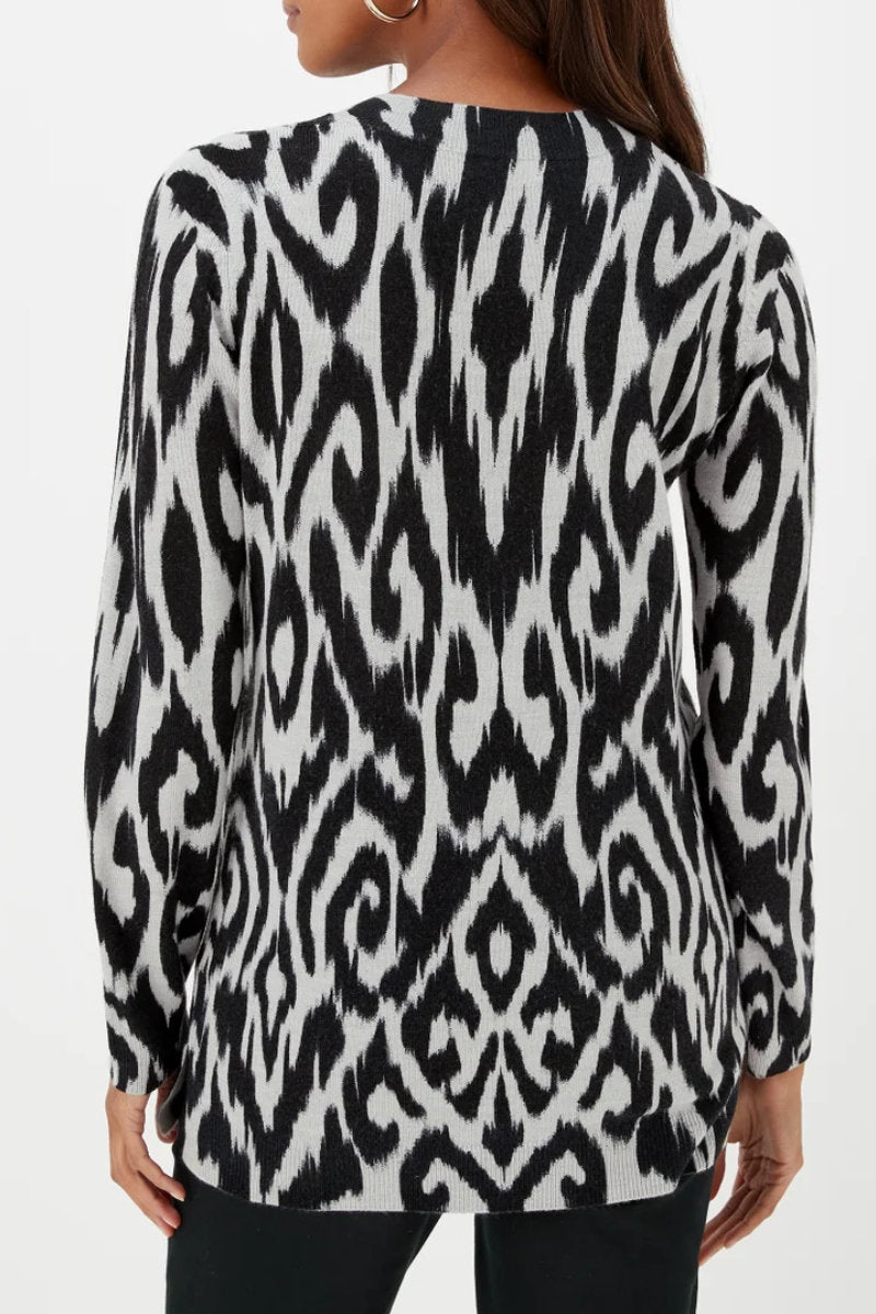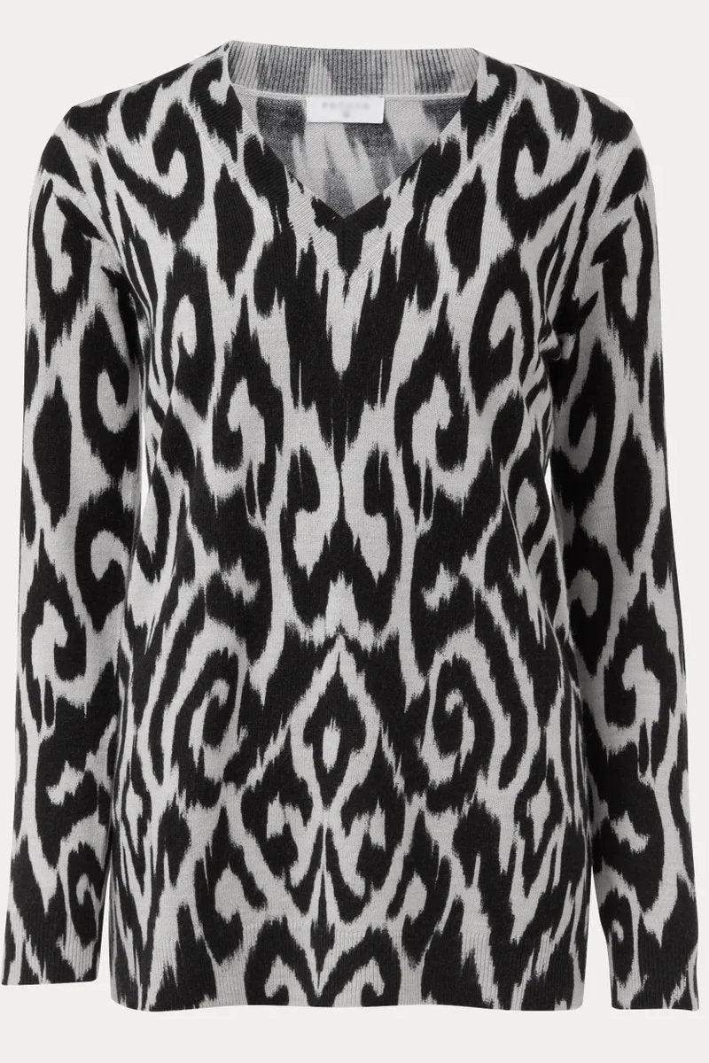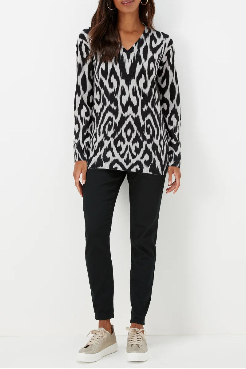 Add a touch of elegance to your wardrobe with this Grey Ikat Print Soft Touch Jumper. Designed with a grey base and striking black Ikat pattern, this jumper brings timeless charm with a modern twist. The flattering V-neckline enhances the neckline, while the cuffed sleeves offer a snug fit, perfect for colder days. Whether paired with jeans for a casual look or dressed up with trousers, this jumper is a versatile, cosy addition to your seasonal essentials.