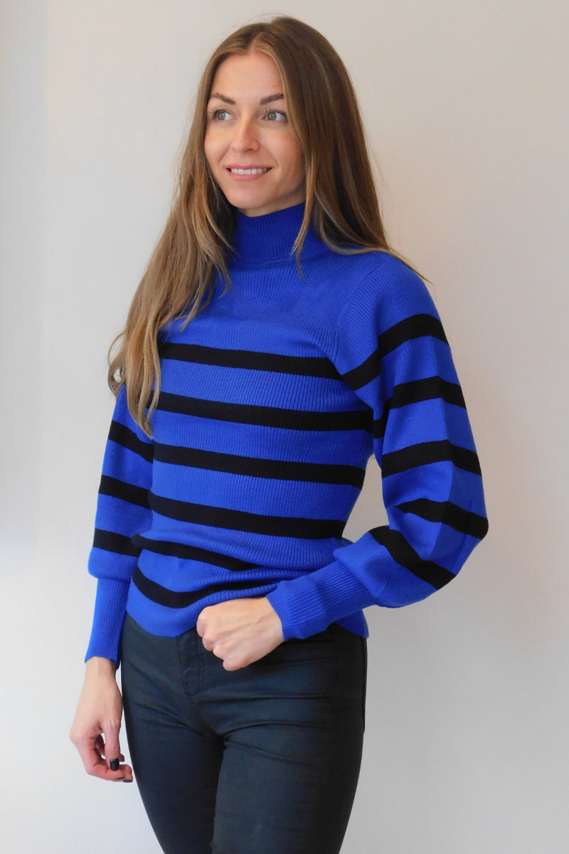 A style to add to your staple wardrobe. Designed in a timeless black and camel colour palette, our super soft jumper features a classic striped design, high neck and long balloon style sleeves. We wear ours with jeans for a casual weekend look.