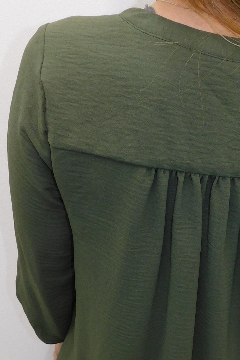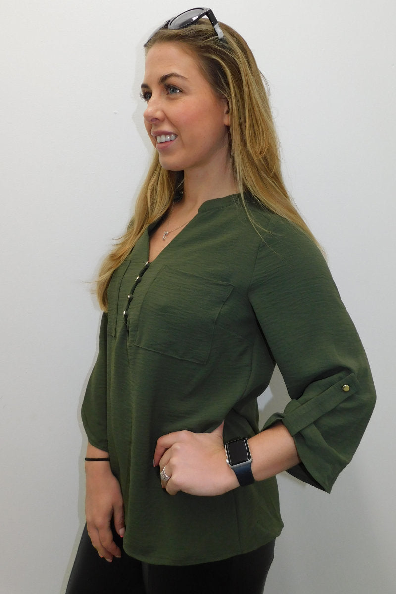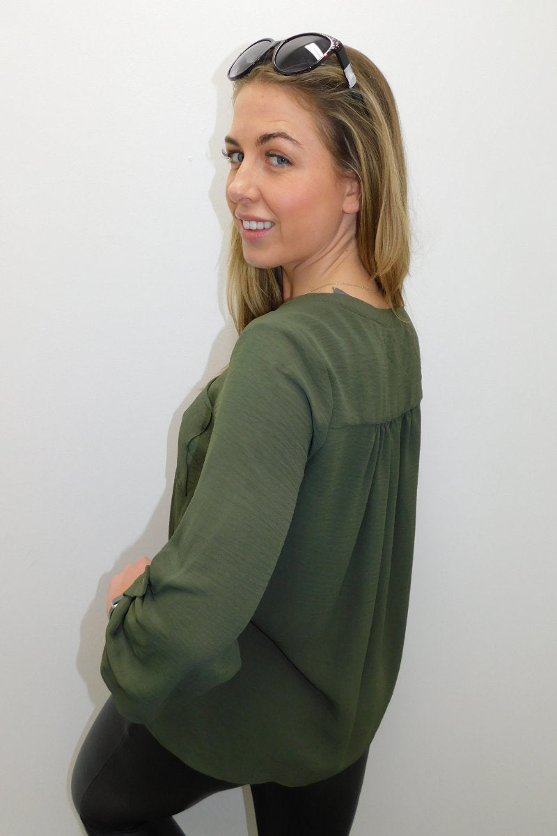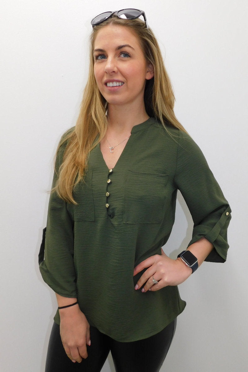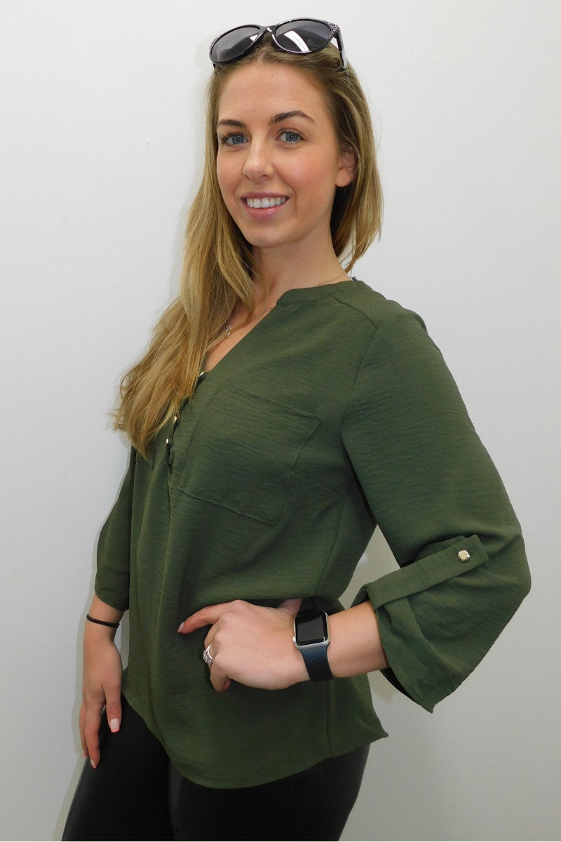 This Olive Long Sleeve Gold Button Front Shirt is a wardrobe staple! Featuring a round neck collar, a gold button up front, and long cuffed sleeves with a single gold button. Dress it up for a night look with leather pants and heels, or dress it down for day time with jeans and some flats.