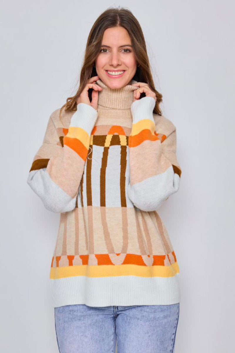 Celebrate love and style with the Amour Bold Stripe Roll-Neck Knit Jumper. Featuring the word "AMOUR" in a standout design, this jumper combines warmth with personality. The vibrant mix of beige, orange, yellow, and blue stripes creates a bold statement, while the cosy roll neck ensures comfort for colder days.
