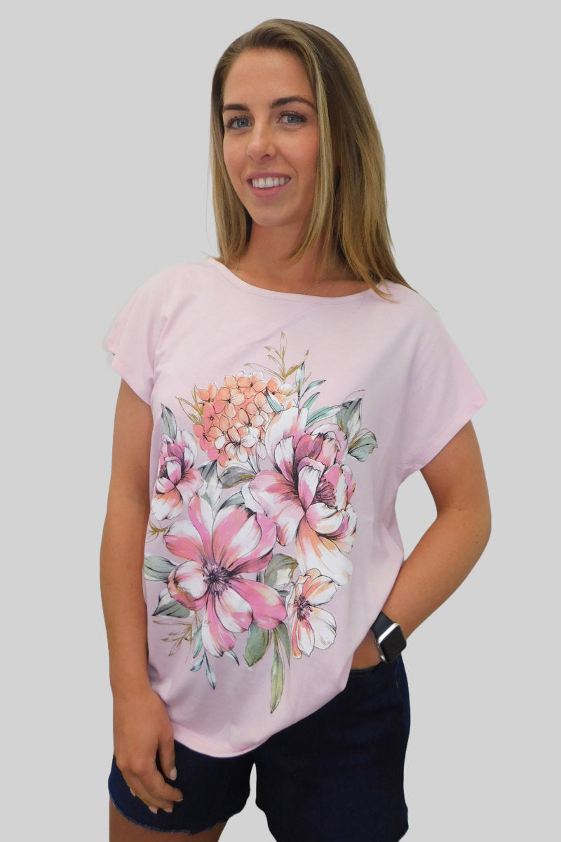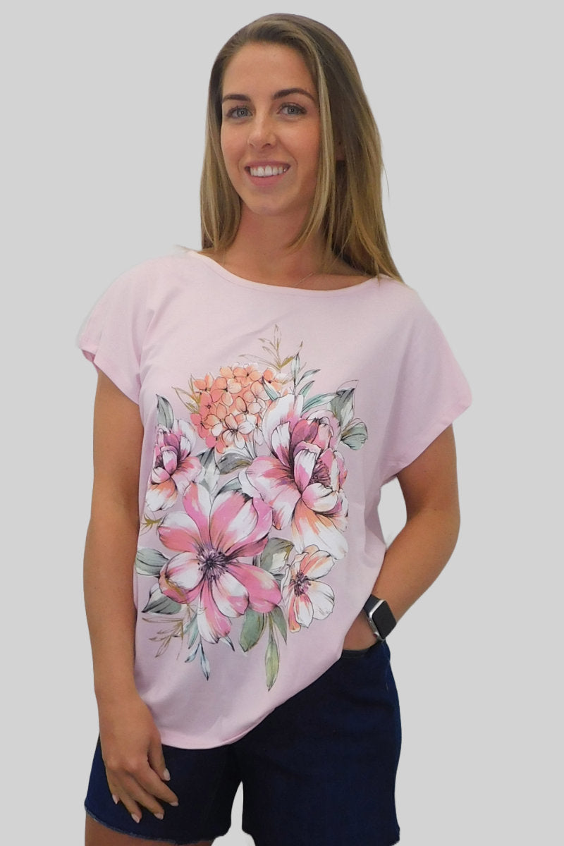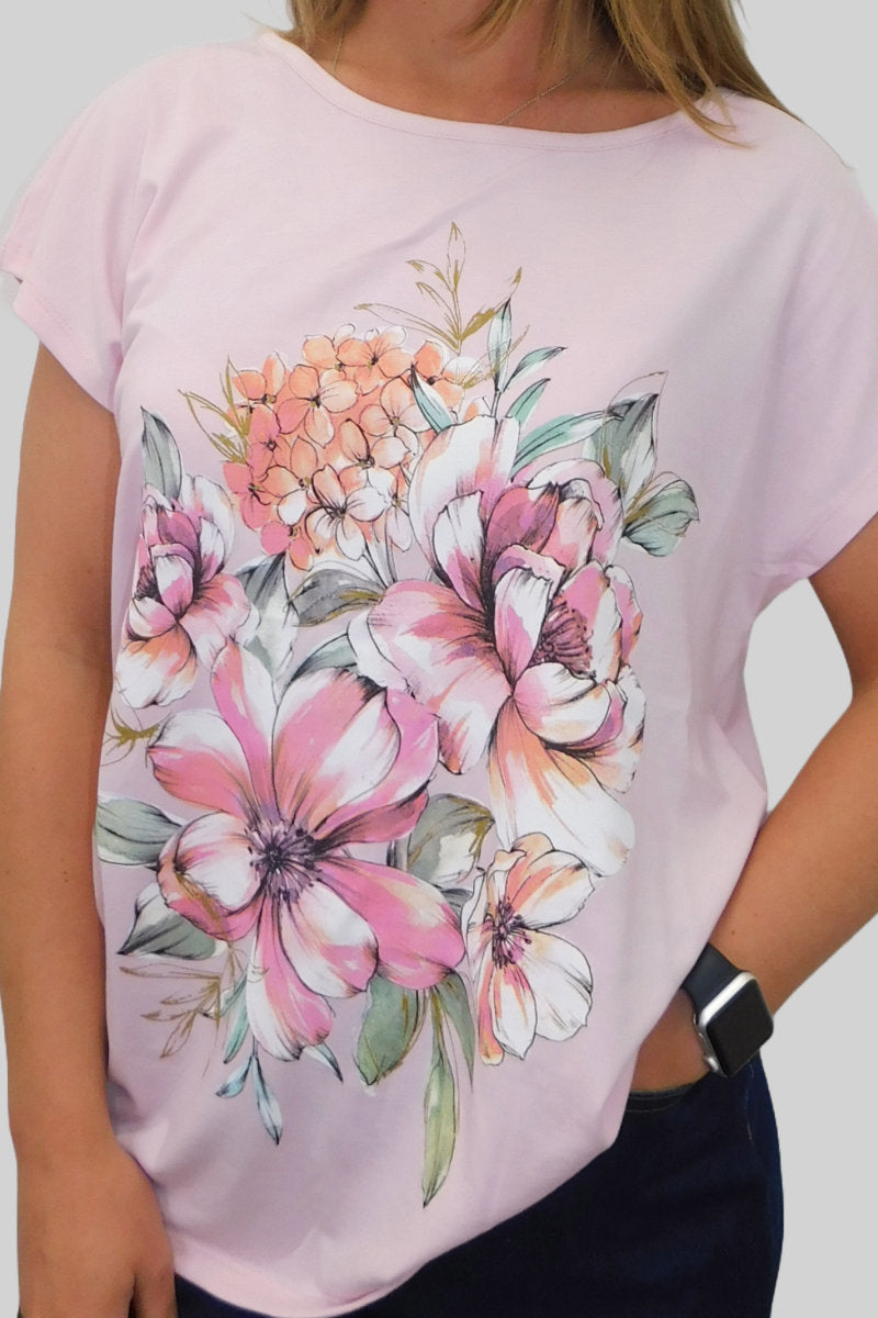 Brighten up your wardrobe with our charming pink floral tee, perfect for adding a touch of elegance and femininity to your everyday look. This delightful T-shirt features a soft pink base colour adorned with a beautiful floral print in shades of pink, peach, and green. The intricate floral design showcases a bouquet of blooming flowers, creating a fresh and vibrant appearance.