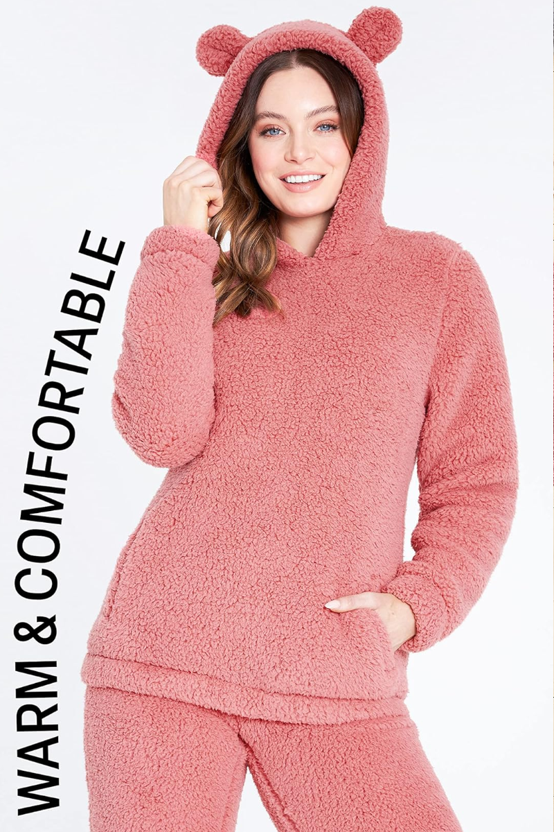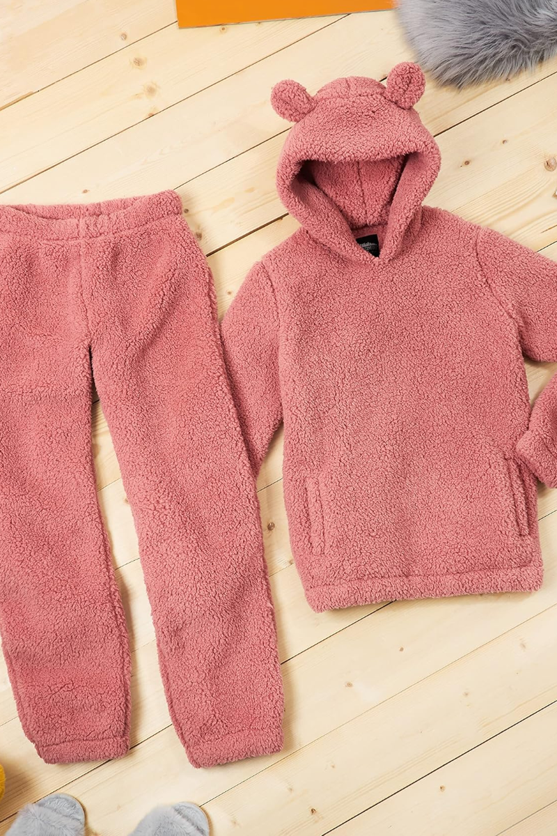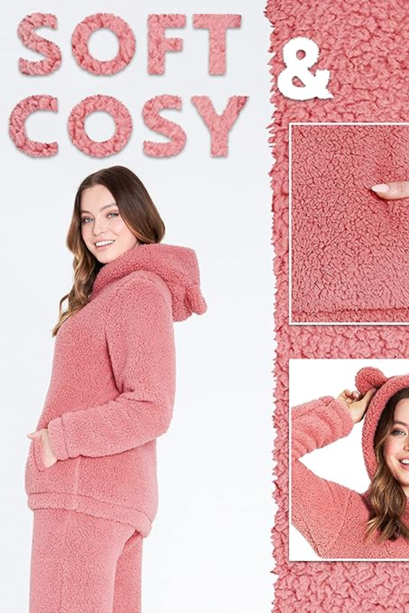 Snuggle up in ultimate comfort with the Ladies City Comfort 2-Piece Teddy Fleece Pyjama Set. Crafted from super-soft fleece (100% Polyester), this cosy loungewear set features a charming teddy bear design with cute 3D ears on the hood, bringing a playful touch to your winter wardrobe. Perfect for lounging at home, these fluffy pyjamas are ideal for chilly nights in.