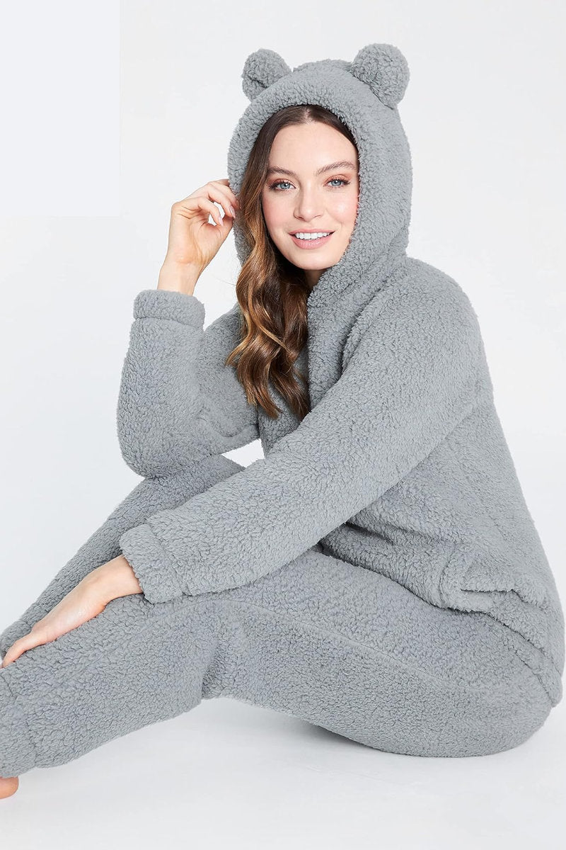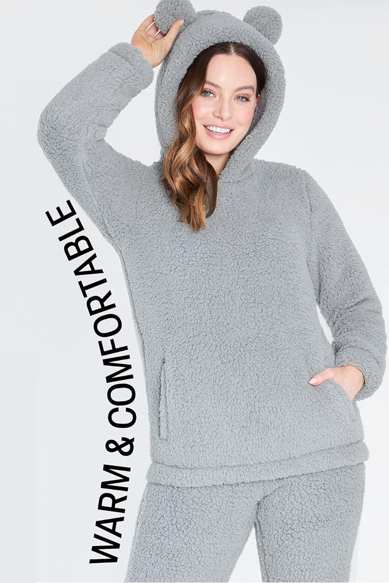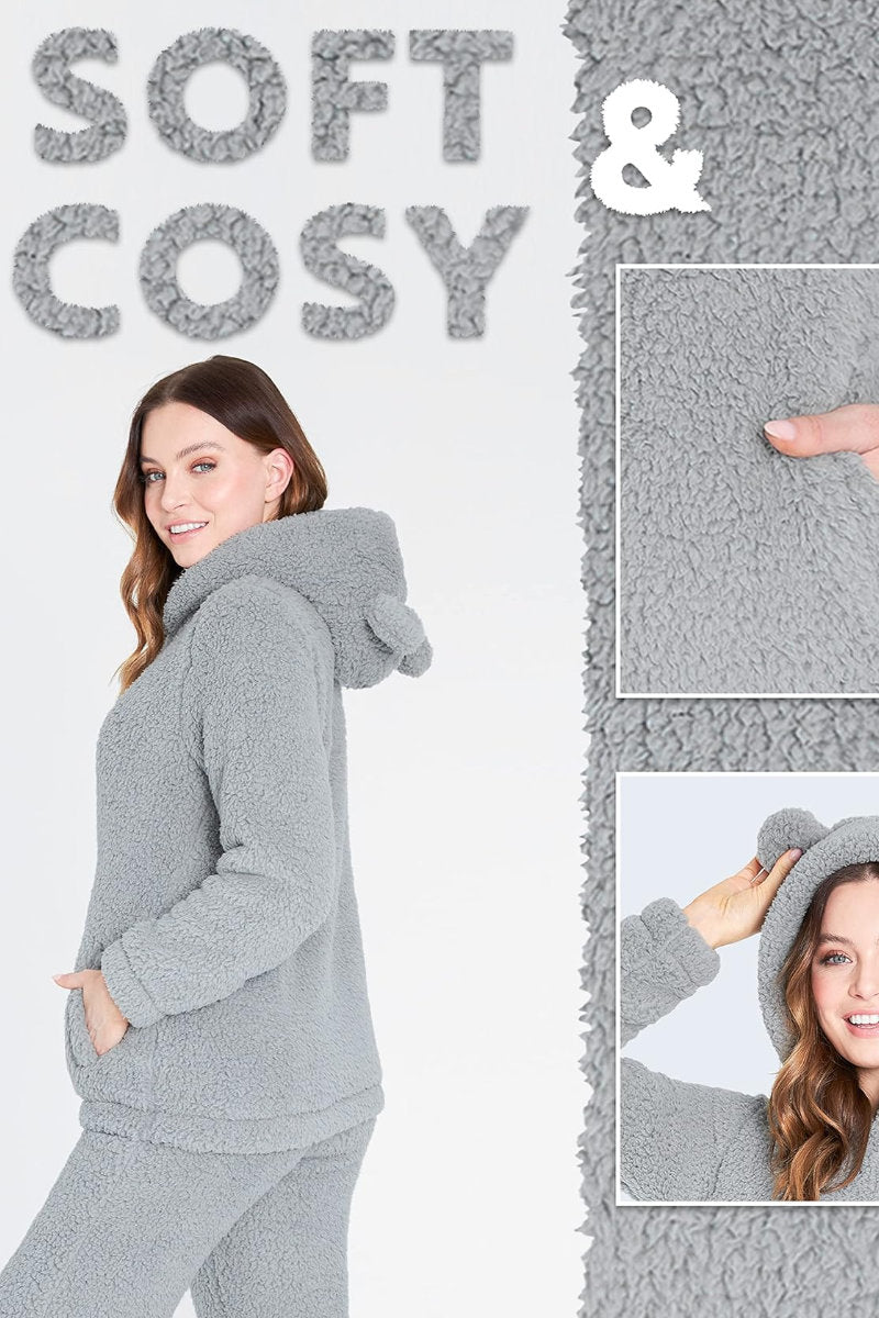 Snuggle up in ultimate comfort with the Ladies City Comfort 2-Piece Teddy Fleece Pyjama Set. Crafted from super-soft fleece (100% Polyester), this cosy loungewear set features a charming teddy bear design with cute 3D ears on the hood, bringing a playful touch to your winter wardrobe. Perfect for lounging at home, these fluffy pyjamas are ideal for chilly nights in.