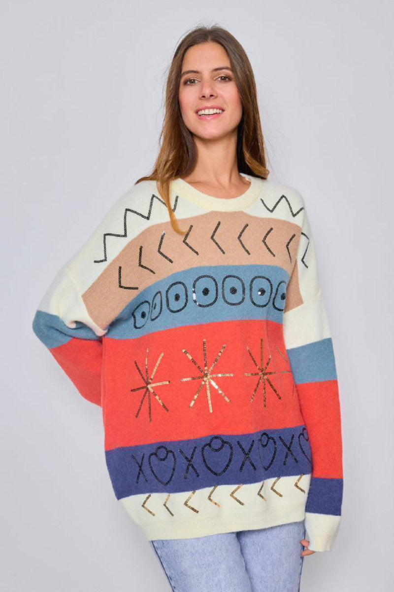 Perfect for layering in cooler seasons, this jumper combines warmth, comfort, and style. Whether paired with jeans for a relaxed day out or dressed up with trousers for a coffee date, it’s a versatile addition to your collection. Its bold colours and elegant sequins make it a unique choice for those who love effortless style with a bit of sparkle.