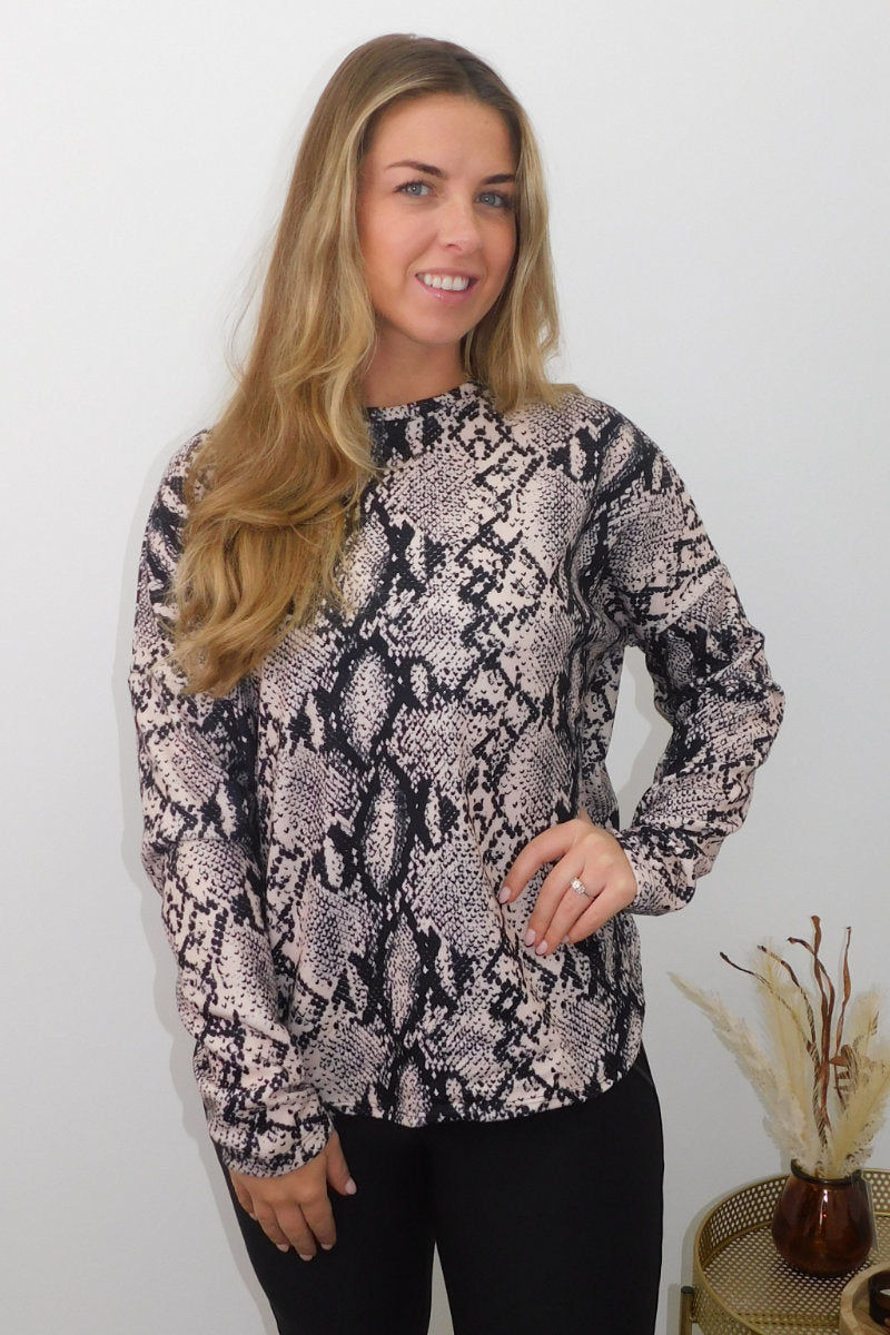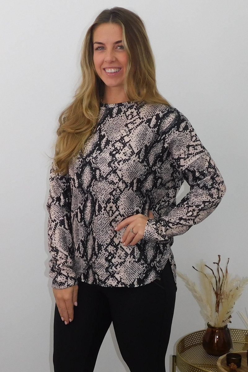 This top offers a perfect combination of comfort and style. The striking snakeskin print adds a chic edge to your outfit, while the brushed fabric ensures you stay cosy all day. Ideal for creating a polished yet relaxed look.