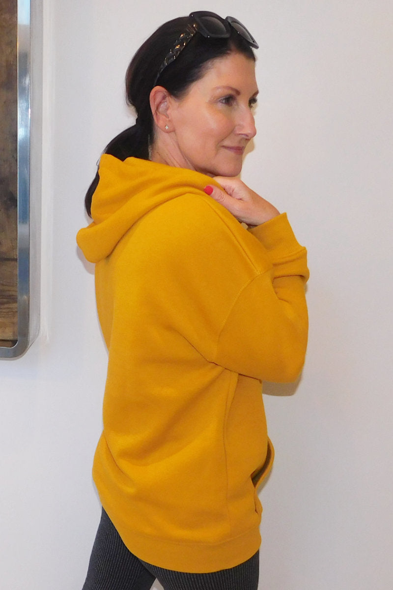Stay cosy with our bold mustard coloured oversized hoodie. A great addition to any work out wardrobe and perfect to throw on over t-shirts for an everyday look. Featuring a hood, drawstring and front pouch pocket.