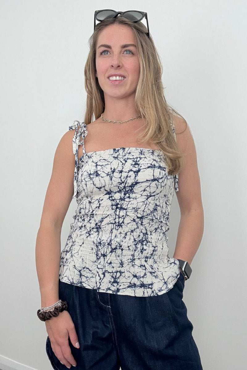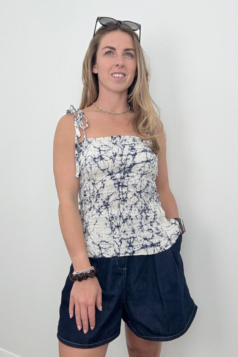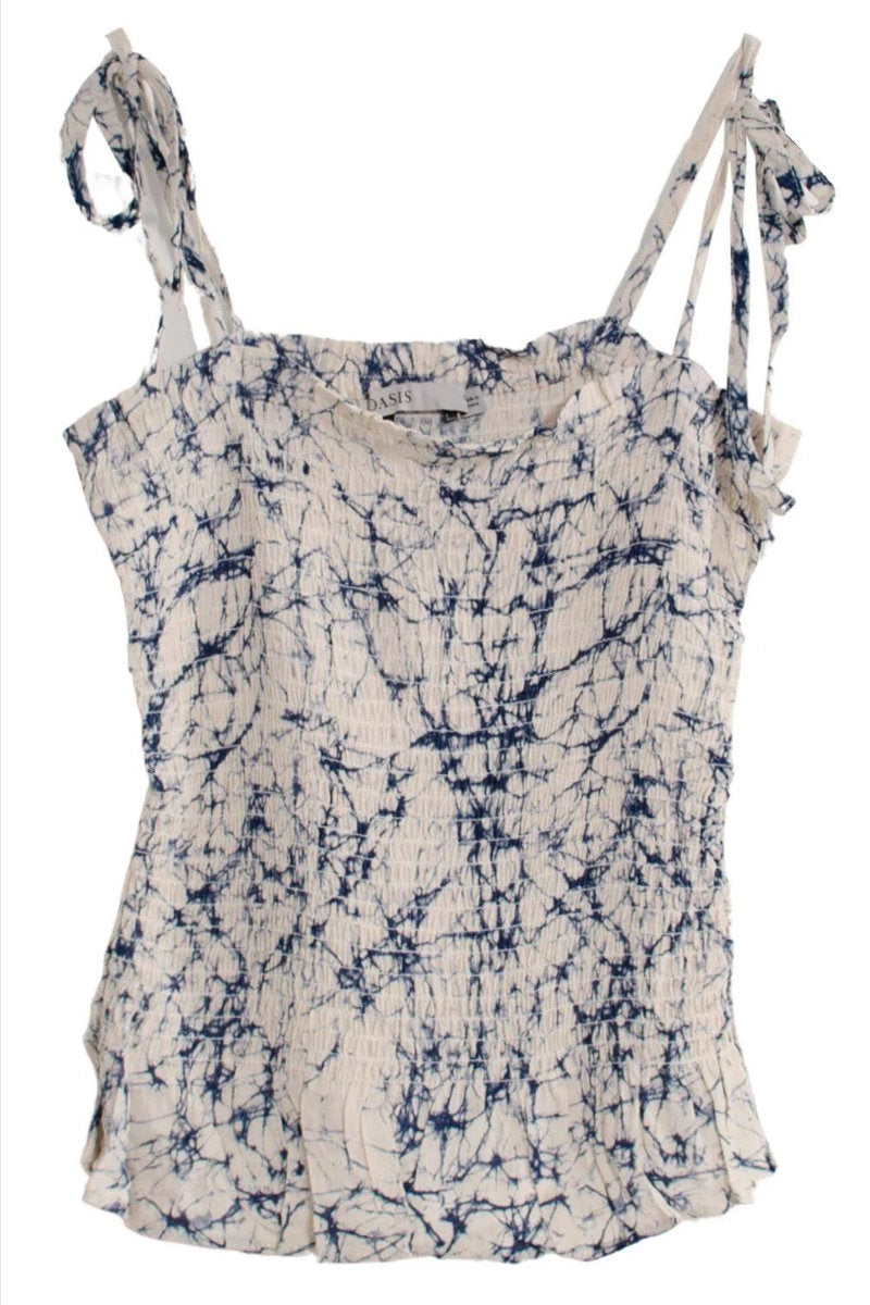 Add a playful twist to your summer wardrobe with this Oasis shirred bandeau top. Designed with all-day comfort in mind, it features a flattering shirred body and adjustable tie shoulders for the perfect custom fit. The soft, lightweight fabric with a unique navy-on-cream tie-dye effect gives this top a fresh, casual vibe – ideal for sunny days, spontaneous getaways, or laid-back weekend plans.