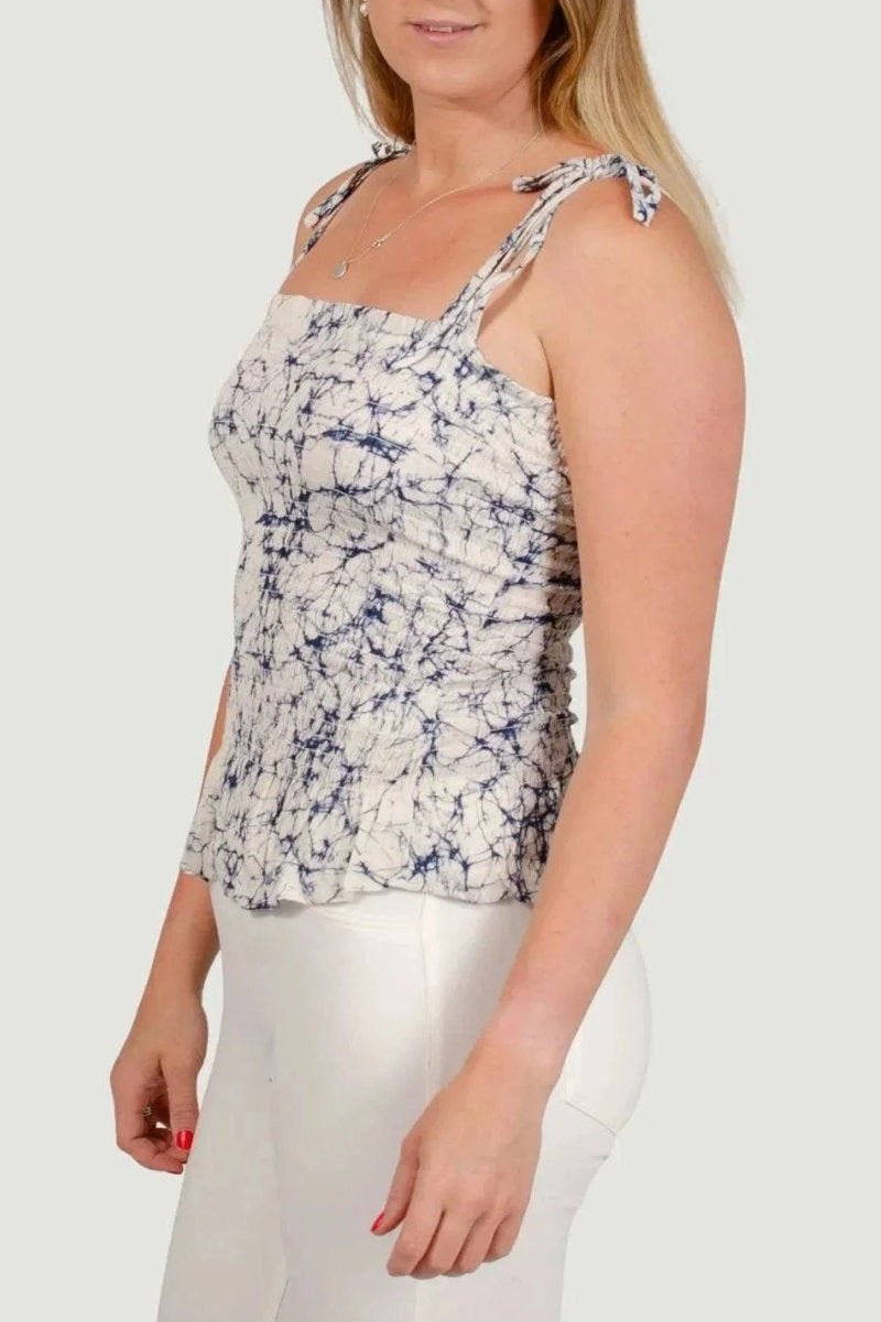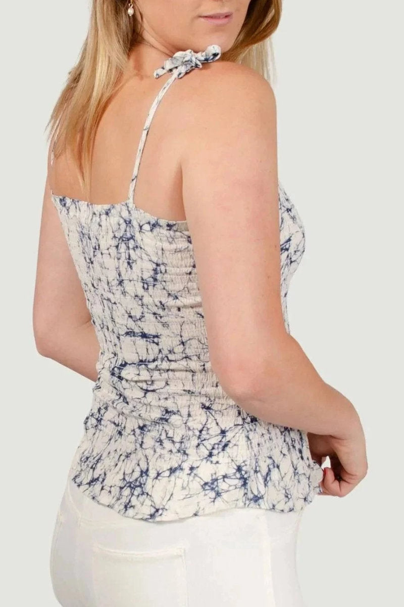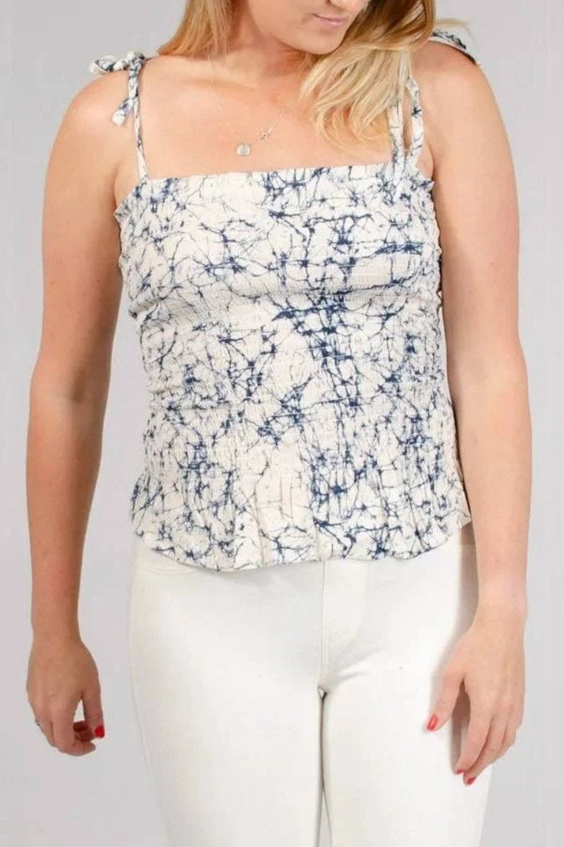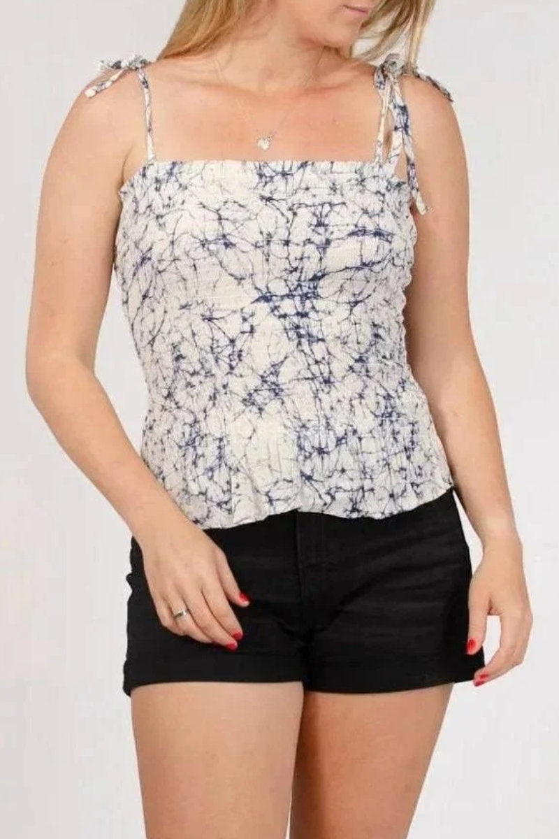 Add a playful twist to your summer wardrobe with this Oasis shirred bandeau top. Designed with all-day comfort in mind, it features a flattering shirred body and adjustable tie shoulders for the perfect custom fit. The soft, lightweight fabric with a unique navy-on-cream tie-dye effect gives this top a fresh, casual vibe – ideal for sunny days, spontaneous getaways, or laid-back weekend plans.