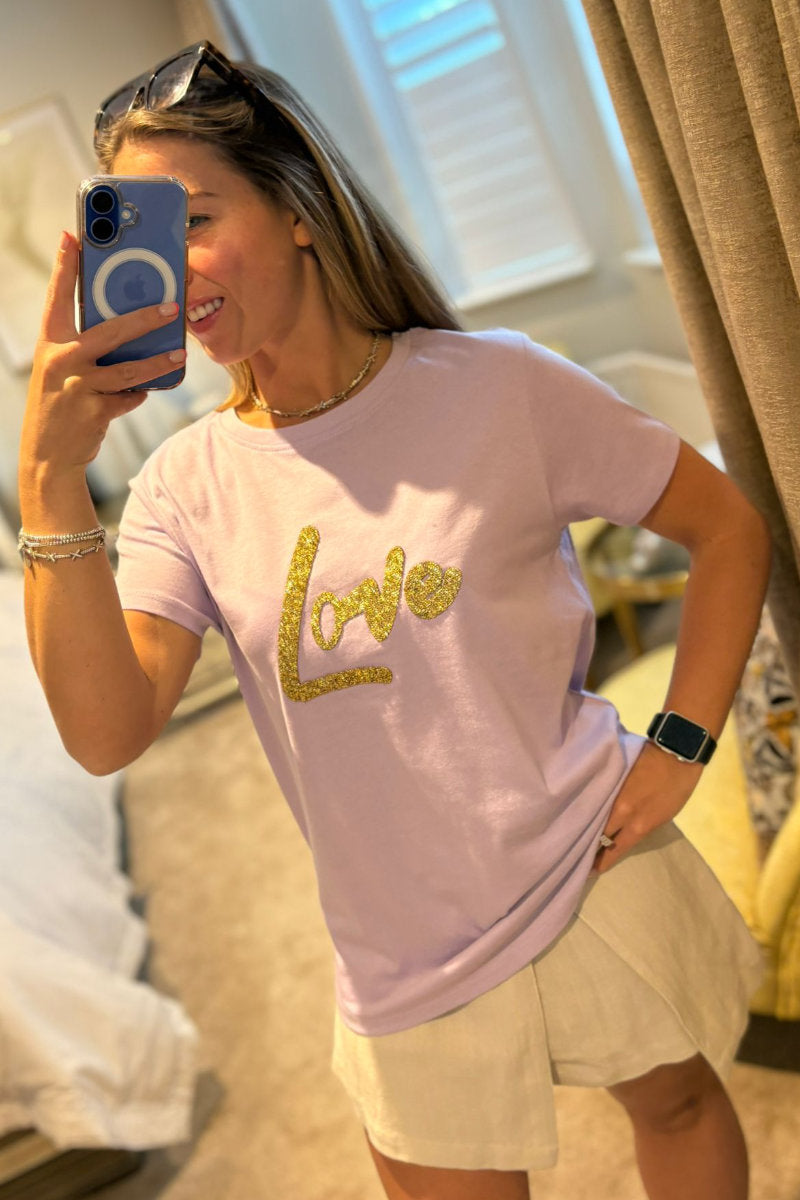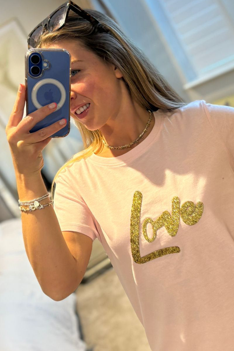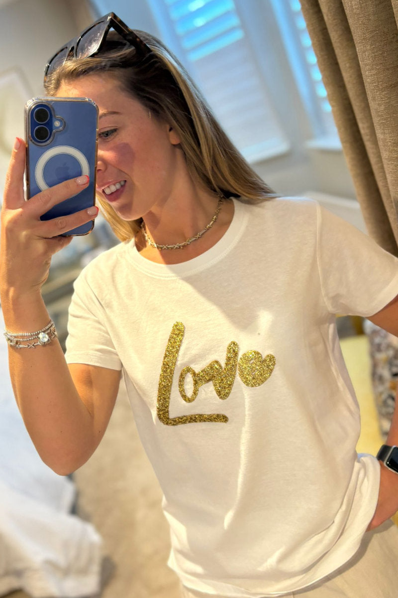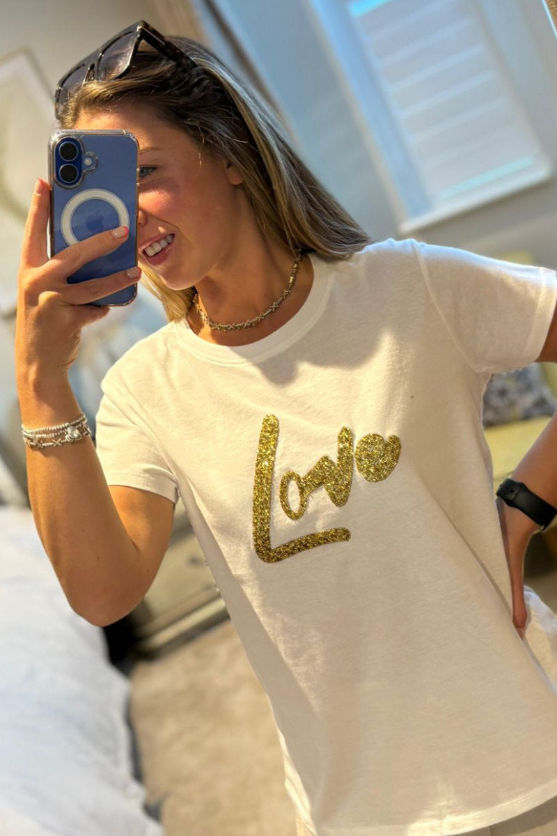 Say it with shimmer. This Paramour tee spells out ‘Love’ in dazzling gold glitter, combining playful design with a soft cotton feel for everyday cool.