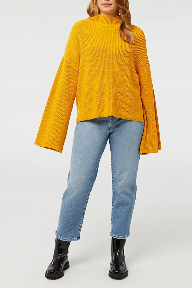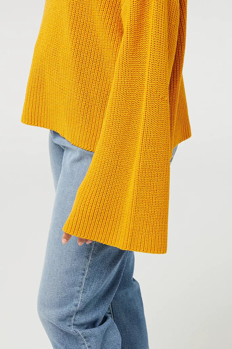 For those who prefer a dash of sunshine in their attire, this Solar Flare Knit Jumper in vibrant yellow is a beacon of joy. Made from eco-friendly recycled acrylic, it brightens up the gloomiest days without compromising on style or warmth. The bell-shaped flared sleeves inject a playful spirit into your ensemble, while the cosy turtle neck ensures you remain toasty when the temperature drops. Its relaxed fit offers comfort and flexibility, making it an effortless match with casual and smart outfits alike, truly a piece that captures the essence of sunny days.