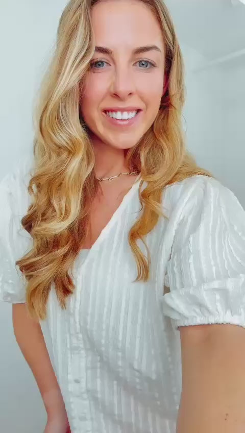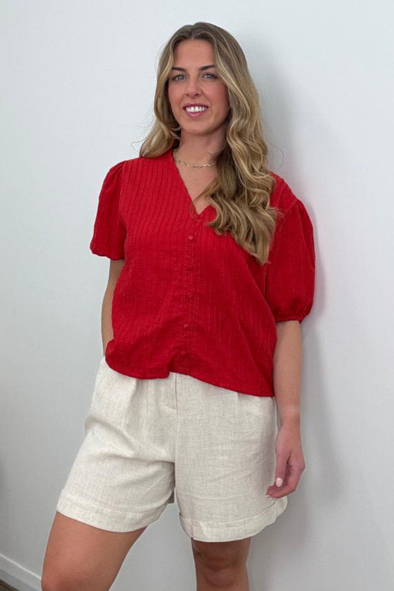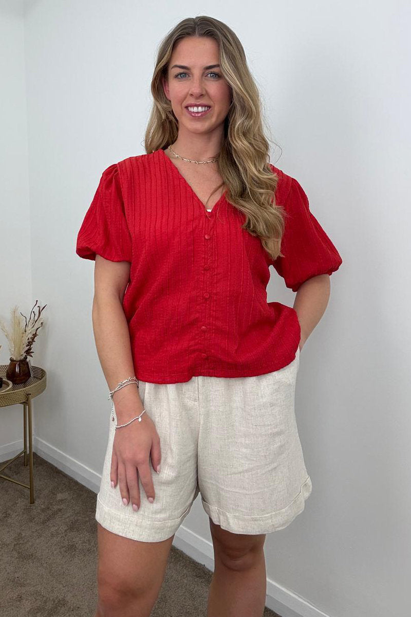 Bring effortless charm to your wardrobe with this textured button front top in two stunning shades – timeless cream and vibrant red. Crafted from a lightly crinkled fabric with subtle vertical detailing, it’s perfect for adding interest to your everyday style. The flattering V-neckline, puffed short sleeves, and covered buttons down the front give it a soft, feminine feel, whether dressed up or worn casually.