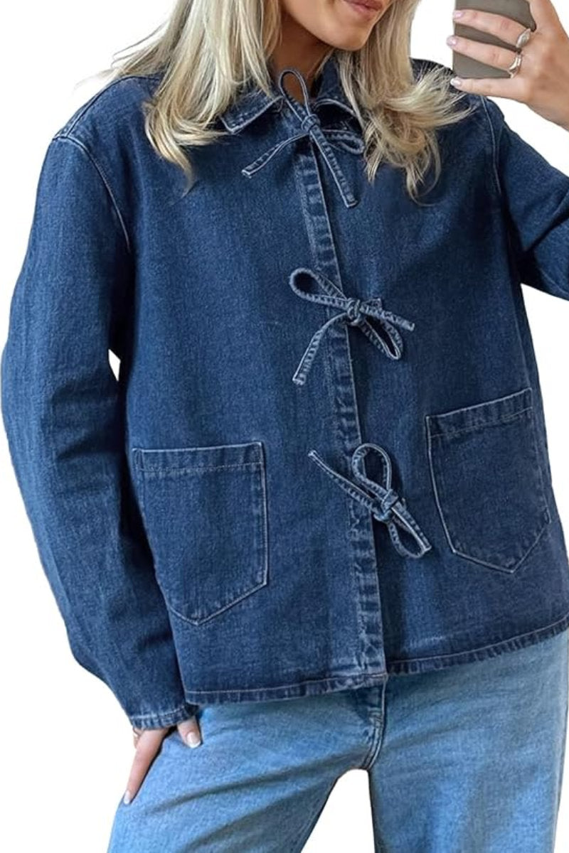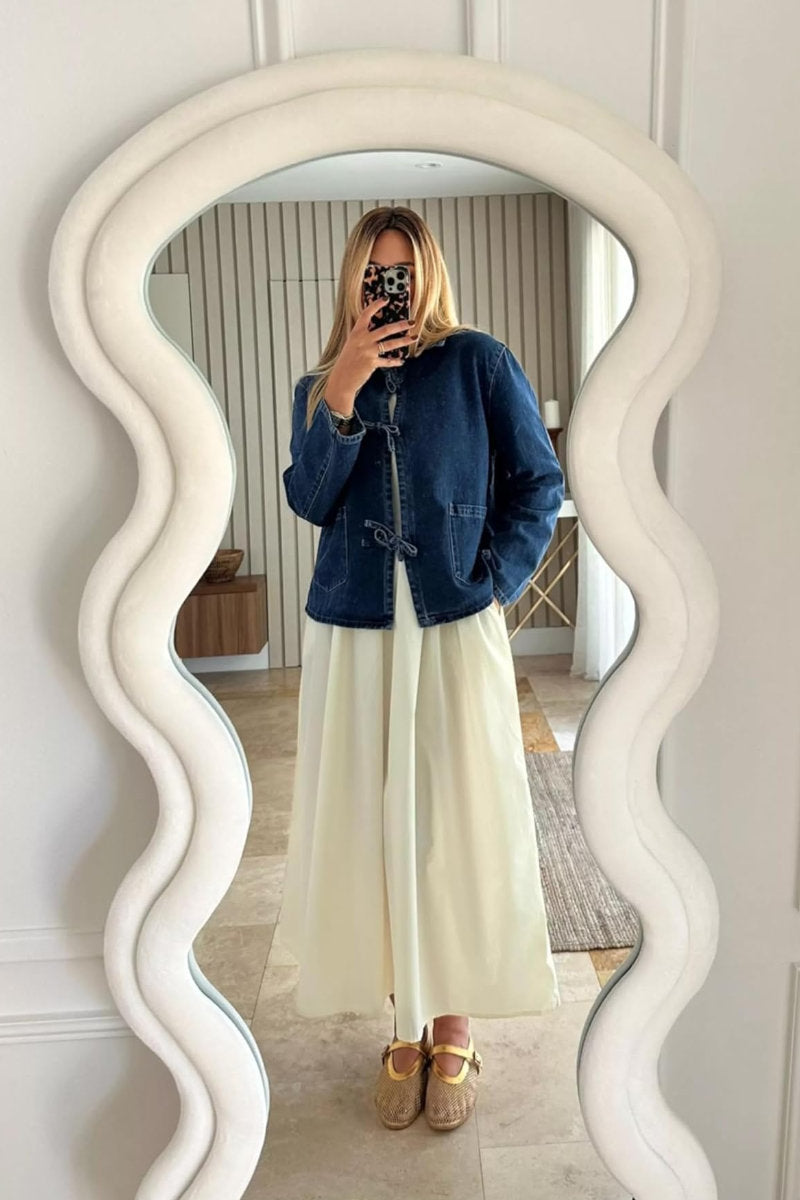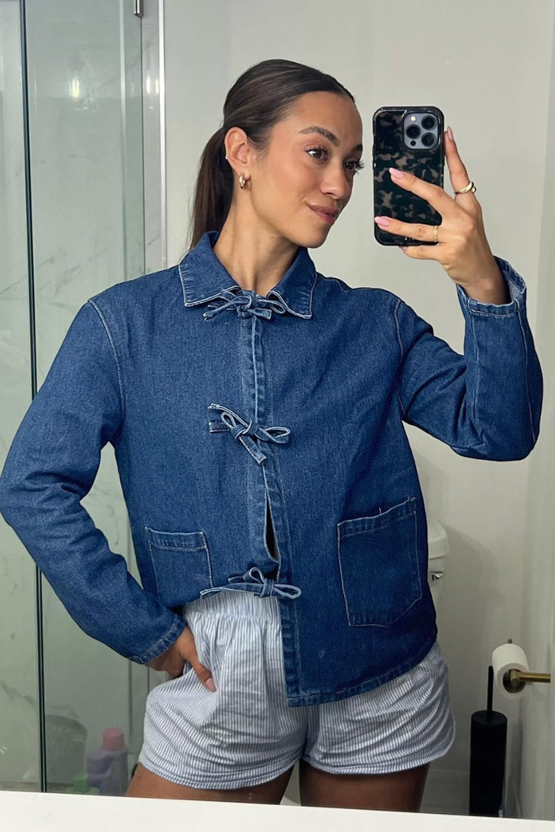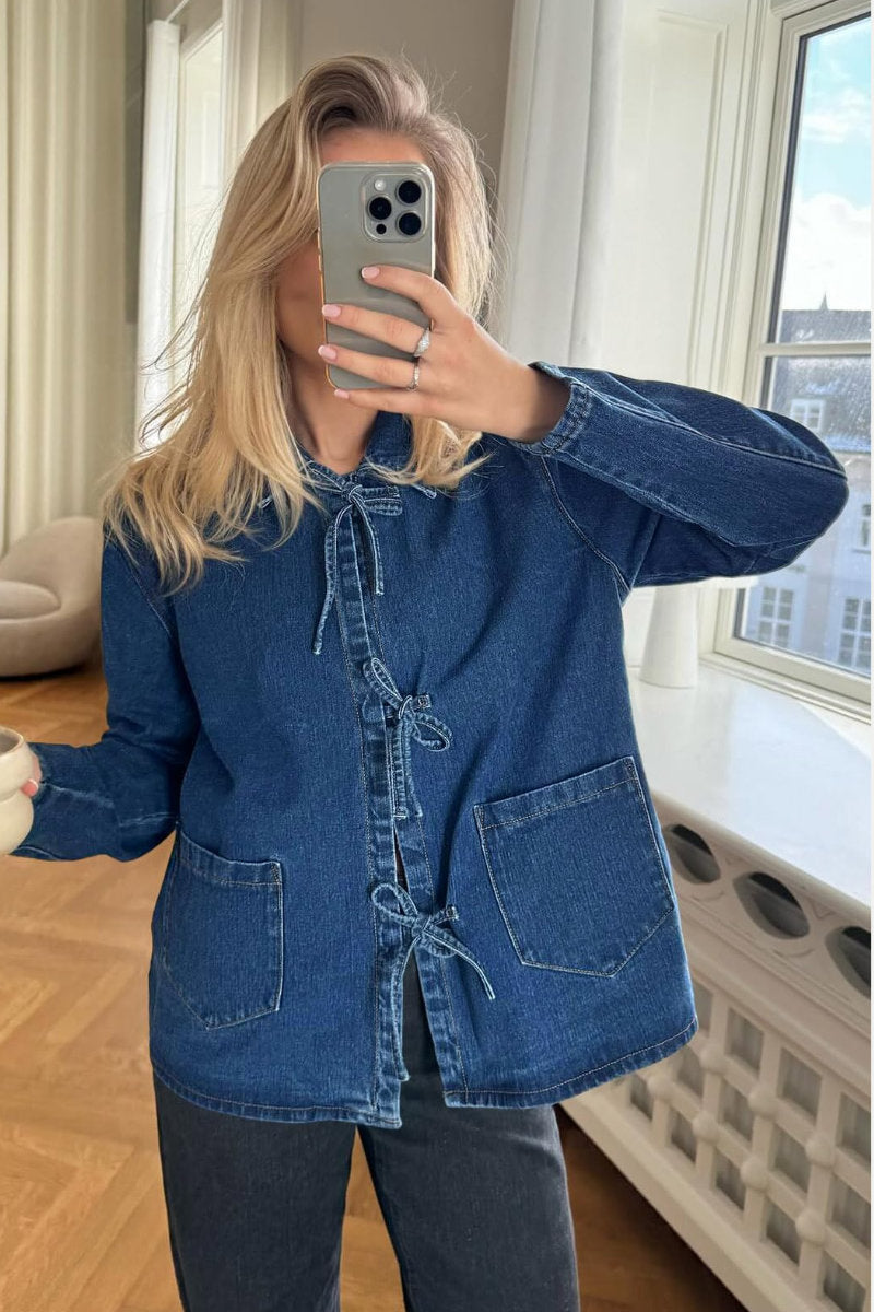 A modern take on the denim jacket, this oversized shacket blends laid-back street style with a feminine twist. Designed in soft, structured denim, it features statement tie fastenings and large patch pockets, giving it a unique, on-trend edge. Whether layered over dresses or teamed with joggers and a tee, this jacket brings effortless cool to any outfit.