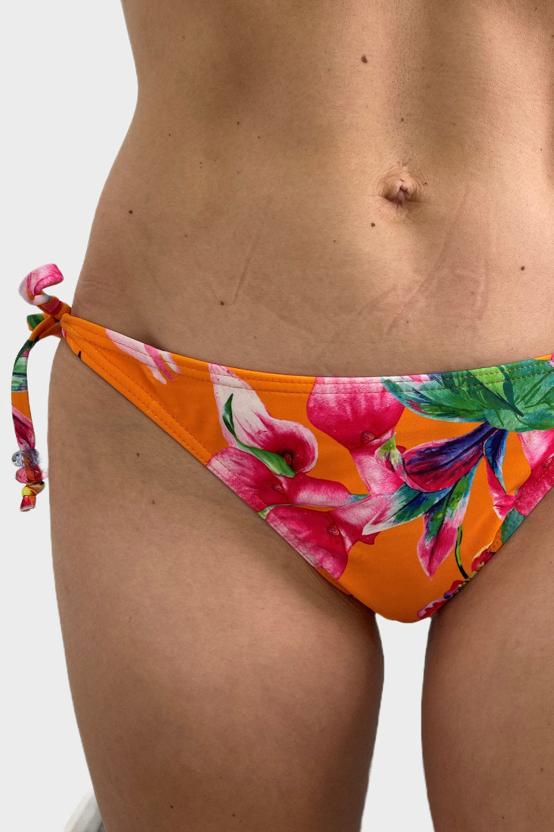 With a colourful floral print this bikini bottom will turn heads at the pool. Tie sides with jewelled ties offer a flattering look.